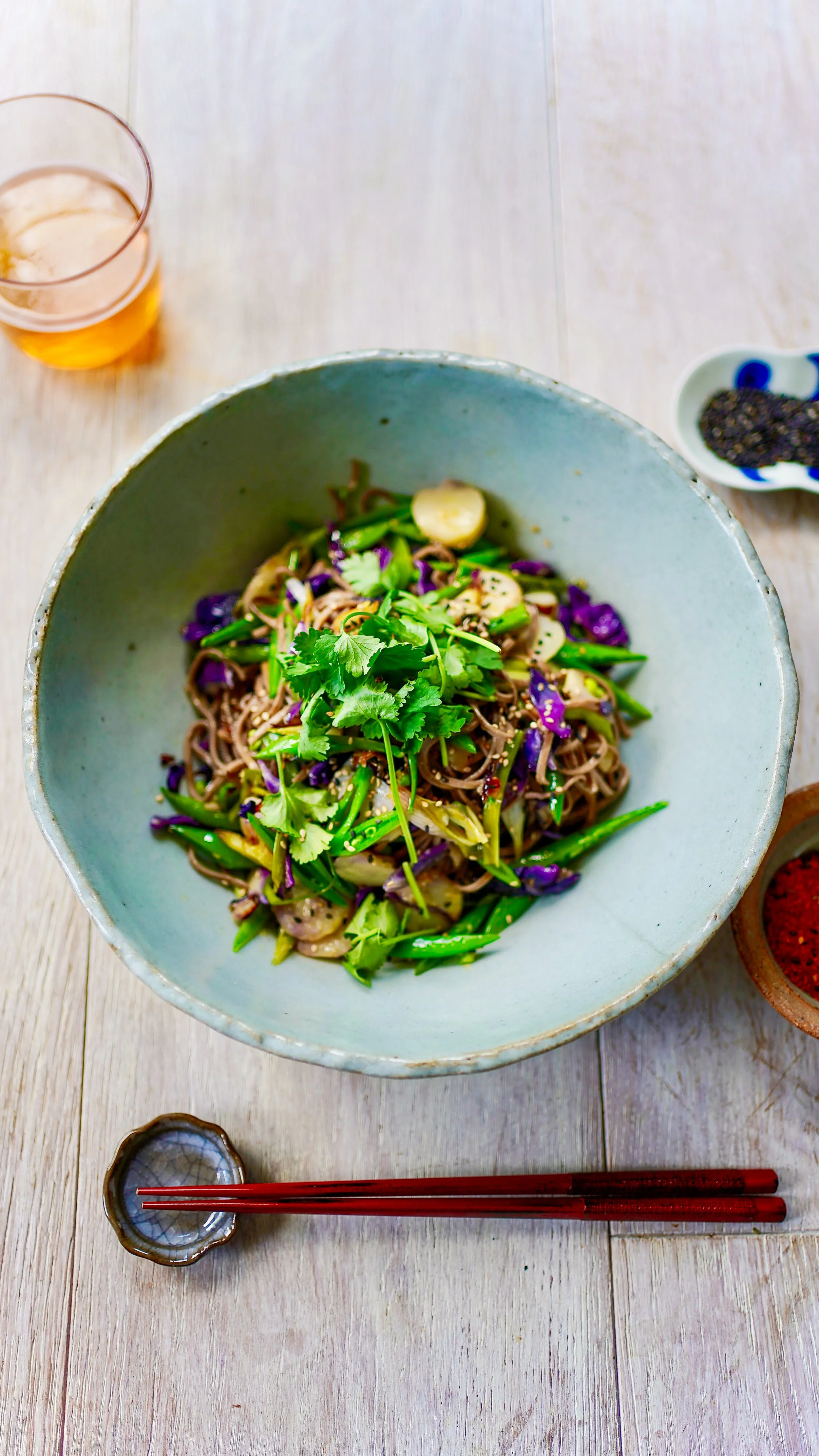 - Place the noodles and sugar snaps in a colander and pour over a kettle of just boiled water to quickly blanch them. Drain, then transfer to a bowl and drizzle with sesame oil to prevent the noodles from sticking together (it also gives them a great aroma).